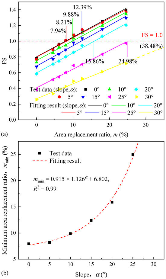 Based on the test results in Section 4.1, the connection between slope stability and area replacement ratio could be further investigated by data fitting, as shown in Figure 11a. The FS values corresponding to the effective area replacement ratios (m = 0~24.56%) were used for the fitting.