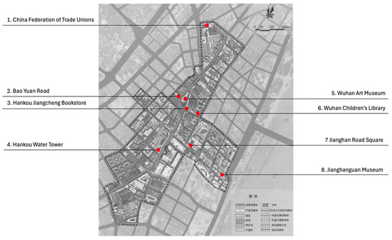 Firstly, the overall situation of Jianghan Road and Zhongshan Avenue historical blocks was understood through the literature, field investigation, and interviews. The second step is to invite experts and children to participate in interviews and questionnaires. The experts come from professional fields such as cultural heritage protection, urban planning, and children’s heritage education, and are familiar with the research objects to ensure the accuracy of the research results. Based on field investigation, this study selects representative cultural heritage education spaces, which are as follows: 1. Memorial Hall of the Former Site of the China Federation of Trade Unions; 2. Bao Yuan Road; 3. Hankou Jiangcheng Bookstore; 4. Hankou Water Tower; 5. Wuhan Art Museum; 6. Wuhan Children’s Library; 7. Jianghan Road Square; and 8. Jianghanguan Museum (Figure 3). Children were randomly interviewed and surveyed, and 200 questionnaires were distributed in eight locations to ensure the universality and randomness of the survey. Through the analysis of the investigation results from two different subjects, this research comprehensively understands the performance of historical districts in education and cultural inheritance, as well as the educational effect of space utilization of historical blocks in children’s education.