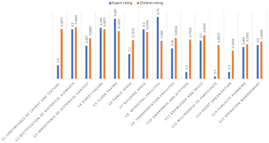 The evaluation results of second-level indicators show that the historic district has achieved remarkable results in the improvement in the physical environment, and has been positively evaluated by professionals. Specifically, the high performance of C2 Rectification of Historical Elements (4.2), C4 Street Facade (4.266), C5 Floor Paving (4.667), C7 Building Space (4.2 points), and C8 Municipal Facilities (4.75 points) highlights that the environmental quality has been significantly improved in the space utilization of cultural heritage in children’s heritage education activities. These improvements not only beautify the neighborhood environment, but also provide a safe, attractive, and educational space for children, and these improvements have been highly recognized by professionals in practical application.