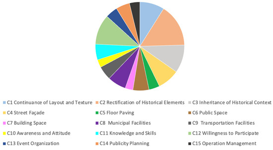 Among the evaluation indicators with higher weight, that is, those considered to be more important, both evaluation subjects showed high satisfaction with C2 (Rectification of Historical Elements) and C4 (Street Facade) (Figure 6). This shows that the protection of historical buildings, the renovation of environmental elements, and the improvement in street facades have been valued and recognized by both sides, and these aspects have achieved remarkable results. However, satisfaction with C3 (Inheritance of Historical Context) is low, which suggests that in the subsequent work, we need to pay special attention to the display of historical figures and events and the inheritance of folk arts in order to make it a key area for optimization and improvement.