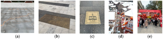 Among the less-weighted evaluation indicators, that is, those considered less important, the performance of C5 (Floor Paving) and C7 (Building Space) was generally considered satisfied by both evaluation subjects. Field research revealed that the paving in the historic district integrates local cultural elements and is embellished with historical maps, traditional patterns, and distinctive architectural drawings. The management generates a strong cultural environment at key architectural spaces based on traditional festival themes and cultural activities (Figure 7). The evaluation of C13 (Event Organization) and C14 (Publicity Planning) is low, indicating that although these aspects need to be improved, they can be a relatively low priority in the follow-up work. These findings provide a clear direction for us to balance resource allocation and improvement measures in future cultural heritage education activities.