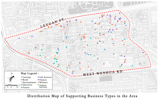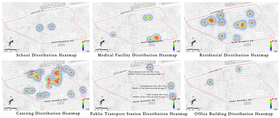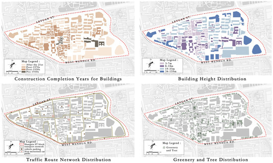 The functional partition in a city includes commercial areas, residential areas, industrial areas, storage areas, cultural and educational areas, scenic areas, comprehensive areas, and development zones [12,13,14]. Shangxin Street is part of a residential historical block. It is mainly composed of low-rise and multistory residential buildings, with multiple schools, hospitals, and cultural attractions scattered throughout (see Figure 1).
