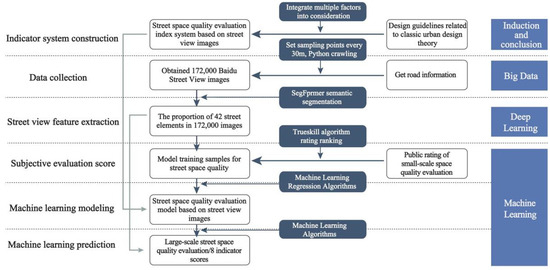 Jinan has been listed in the second batch of historical and cultural cities announced by the Chinese state. However, in regard to Jinan’s urban construction, some areas have experienced problems, such as being too negligent and having insufficient awareness of protection. This has resulted in the destruction or demolition of many original old streets, alleys, and buildings with rich historical connotations. While many old cities have lost their vitality during urban development, the remaining spatial forms still have enormous development potential. Their reconstruction plays an important role in the development of new urban elements in the surrounding areas. The cultural revival and spatial heritage reuse of old city blocks are closely related to the process of urban renewal. To date, extensive research on how to improve the quality of urban street space has been carried out by scholars at home and abroad, focusing on the following three aspects. The first is research on the evaluation of the quality of street space. Pei established a framework for the evaluation of the quality of street space in Dongcheng District, Beijing, from the perspectives of responsibility and legal rights, emphasizing the necessity of clarifying rights and responsibilities in the evaluation of the street space quality. Di compared the green space quality of different streets through a multidimensional and sub-index comprehensive evaluation framework for urban street space quality, providing scientific support for precise street space renewal design [1]. The second aspect is the analysis of the factors and mechanisms influencing the quality of street space. Representative studies are as follows. Long explored the contributing factors of green space quality in streets from a human perspective and evaluated the space quality based on the following two aspects: the level of street greening and the degree of urban image recognition [2,3,4]. The third aspect is the quantitative study of the balance between the supply and demand regarding the green space quality in streets. Representative studies are as follows. Wang suggested that the quantitative analysis of the supply and demand relationship in the green space quality of streets can better reflect the human–land relationship in the city, and that it is of great significance with respect to enhancing fairness and citizen well-being. Ye collected street view data on all streets in Shanghai Central City based on Baidu Street View, and used a machine learning algorithm to analyze the matching degree between the supply of street green space and its demand among the people, followed by identifying specific optimized streets. Cao constructed a quantitative measurement model with street view images and machine learning, providing reference methods for large-scale street green space evaluation [3,4,5,6].