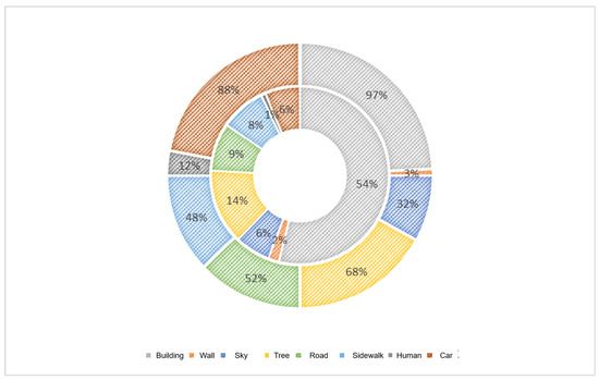 Deep learning data-based FCN visual image semantic segmentation tools are used to identify 150 material spatial elements, such as plants, buildings, roads, sky, and public facilities, in the street view data, to reclassify the material spatial elements, and to calculate the proportion of each type of element (see Figure 5).