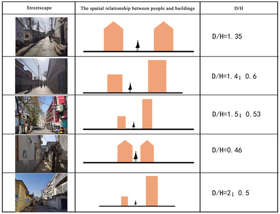 The spatial green vision rate of the Qilu Hospital area is 14%, with a relatively low overall green vision rate. Only some streets and alleys have continuous greening, mainly consisting of tall roadside trees. The degree of openness is 6%. This low openness is mainly due to the canopies and building obstructions in some street and alley spaces, features that make the space varied and unoppressive. The enclosure degree is 56%, with a strong sense of spatial enclosure (see Figure 6). Some streets and alleys have a high street aspect ratio (D/H: the ratio of the street space width to the enclosed interface height), mainly due to the narrow width of the street and the alley space itself [26,27,28]. However, the buildings and street walls on both sides are high. An overly continuous interface can easily create a sense of blockage. The walkability of the street is 8%, which accounts for the lower proportion of the visual perception contributed by street and alley spaces compared to roads. Some streets and alleys lack sidewalks, and there is also the phenomenon of static traffic encroaching on pedestrian spaces. The proportion of pedestrian flow is only 1%, which is lower than the proportion of motor vehicles (6%). In instances of low pedestrian rights and streets mainly serving residential purposes, with few commercial activities, such as ground-level shops, the levels of pedestrian activities are also relatively low [29,30,31,32].