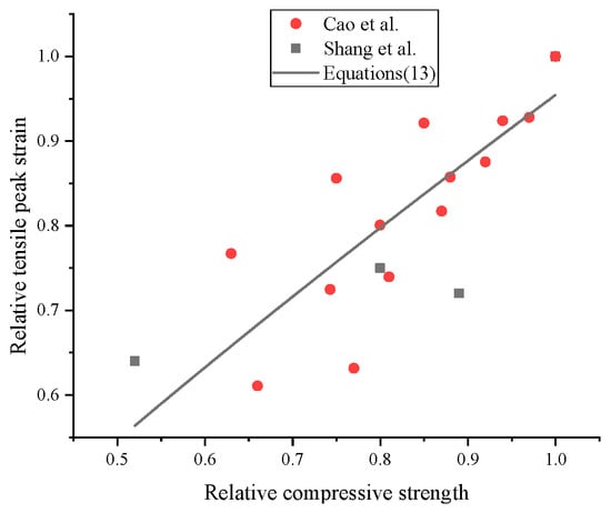 Based on the experimental data from Cao et al. [41] and Shang et al. [42], the fitting process for the relationship between the relative peak tensile strain and the relative compressive strength is shown in Figure 6. The corresponding formula is given in Equation (13).