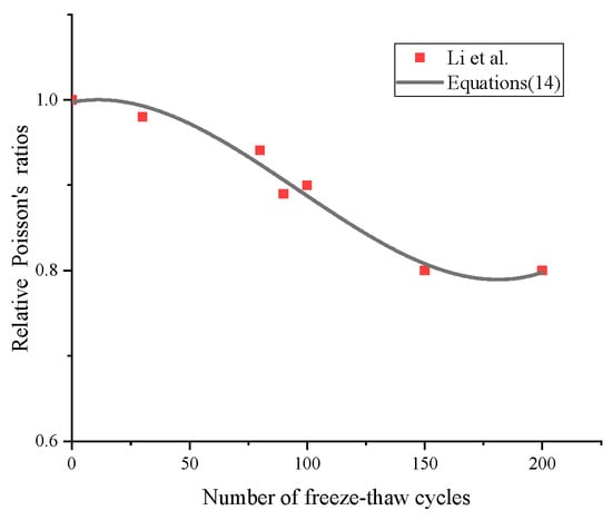Poisson’s ratio is an indicator of the lateral deformation of concrete. Under the action of freeze–thaw cycles, the material’s Poisson’s ratio will also undergo corresponding changes. Li et al. [43] studied the variation of Poisson’s ratio of materials subjected to freeze–thaw cycles. The fitting process is shown in Figure 7, and the relationship is shown in Equation (15).