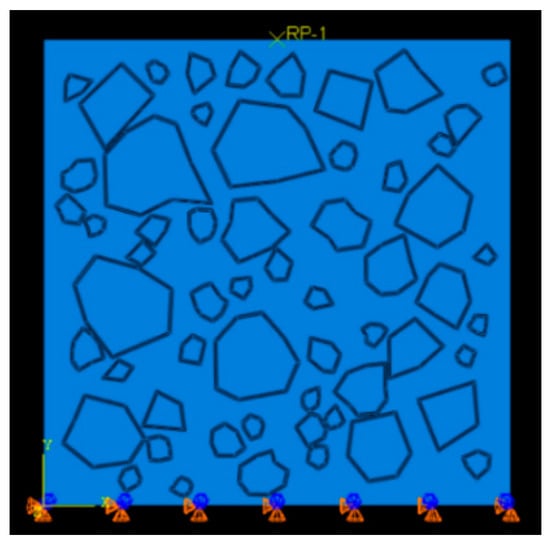 The two-dimensional, fine-scale model of concrete with 40% coarse aggregate content (denoted as Figure 2a) is chosen for rationality verification. First, the parameters of the mortar and ITZ under each freeze–thaw cycle are input into the model generated in the ABAQUS 2016. Then, numerical simulations are conducted on uniaxial compression tests on the fine-scale model to obtain the load–displacement curves under 0, 50, 100, and 150 freeze–thaw cycles, and, thus, the stress–strain curves are obtained. The numerical simulation method for the uniaxial compression of concrete involves fixing the bottom edge of the concrete specimen with free boundaries on the sides. A reference point, RP-1, is selected at the center of the top edge of the specimen for coupling. A downward load is applied to the reference point in a displacement-controlled manner, as shown in Figure 8. The seven orange and blue markers at the bottom of Figure 8 represent the fixed points of the concrete specimen