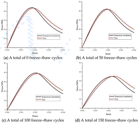 Comparison of the experimental and numerical stress–strain curves under various freeze–thaw cycles.