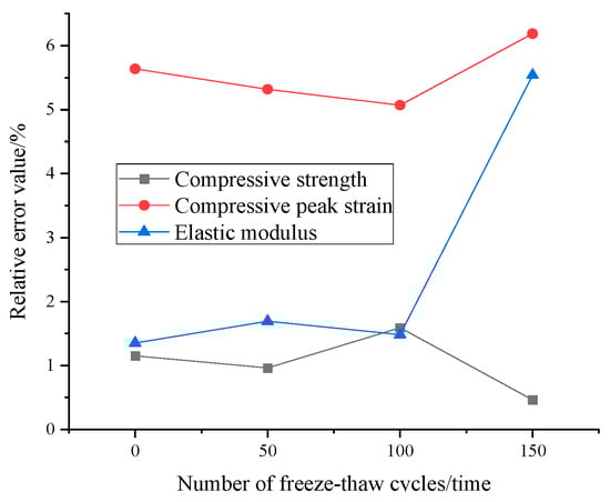 To visually compare the numerical simulation results with the experimental data, a statistical analysis of the compressive strength, compressive peak strain, and elastic modulus of the concrete after the freeze–thaw cycles was conducted. The key performance parameters of the concrete under different freeze–thaw cycle numbers are as follows: for 0 cycles, the elastic modulus is 32.98 GPa, the compressive strength is 44.1 MPa, and the compressive peak strain is 0.00179; for 50 cycles, the elastic modulus is 31.25 GPa, the compressive strength is 42.11 MPa, and the compressive peak strain is 0.001904; for 100 cycles, the elastic modulus is 28.16 GPa, the compressive strength is 39.59 MPa, and the compressive peak strain is 0.002061; and, for 150 cycles, the elastic modulus is 23.82 GPa, the compressive strength is 34.98 MPa, and the compressive peak strain is 0.002289. The error analysis of the numerical simulation results compared to the experimental data yielded relative errors, as shown in Figure 10.