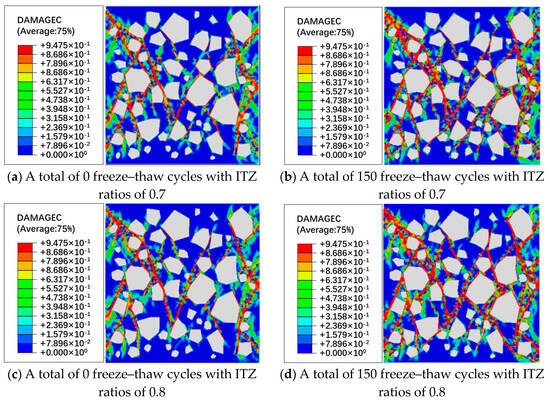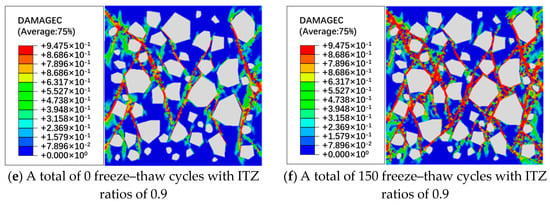In this study, the development of internal cracks in concrete after 150 freeze–thaw cycles under different scenarios with ITZ ratios of 0.7, 0.8, and 0.9 was investigated. The microcrack distributions in the concrete at peak stress are illustrated in Figure 12.