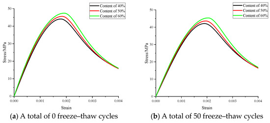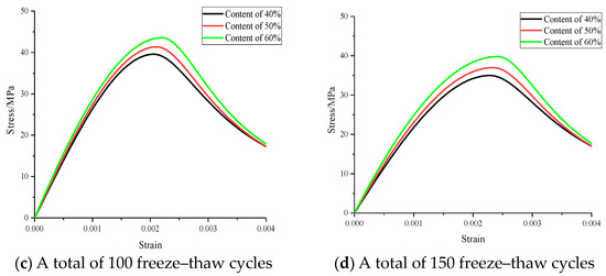 Numerical simulations of uniaxial compression tests were conducted on the mesoscopic models to obtain the stress–strain curves under different freeze–thaw cycles and different coarse aggregate contents, as shown in Figure 13.