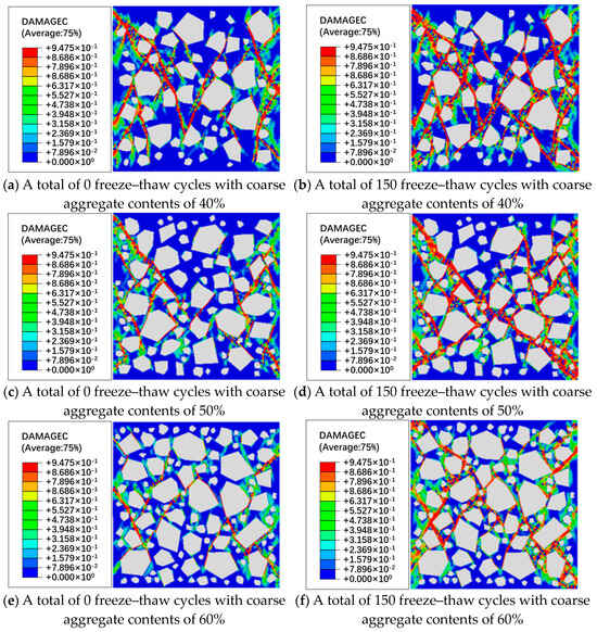 This section also investigates the micro-damage contours of concrete at the maximum stress under 150 freeze–thaw cycles with coarse aggregate contents of 40%, 50%, and 60%, as shown in Figure 14.