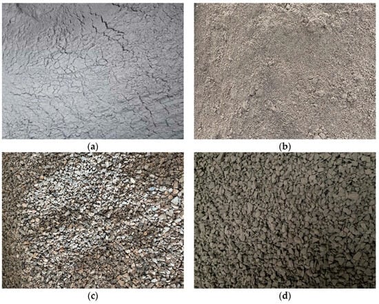 Fly ash, manufactured sand and coarse aggregate. (a) Fly ash. (b) Manufactured sand. (c) Particles with sizes of 5–10 mm. (d) Particles with sizes of 10–20 mm.