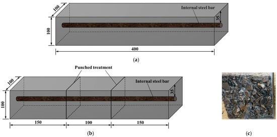 Two types of manufactured-sand-reinforced concrete specimens, including an integrally formed (IF) specimen and a wet joint specimen with punched interface (PI), were prepared in a simulated plateau environment. The IF and PI specimens were prisms of 100 × 100 × 400 mm. The IF specimen was cast as a whole and the PI specimen was cast in two parts. A Φ12 HRB400 steel bar was set in the specimen, which had a protective layer with a thickness of 35 mm. The initial mass of the steel bar was weighed with an electronic scale whose accuracy was 0.01 g. And a wire was connected at one end of the steel bar to facilitate electric corrosion before casting the concrete, which was sealed with epoxy resin glue. For the PI specimen, its preparation process included two steps. Firstly, a stop block of 100 × 100 × 100 mm was set in the longitudinal middle part of test mold of 100 × 100 × 400 mm. Then both ends of specimen were cast to dimensions of 100 × 100 × 150 mm. After 24 h, the concrete had hardened, the stop block was removed, and the joint interfaces were roughened with a high-pressure water gun. Finally, the concrete of 100 × 100 × 100 mm was cast in the middle of the PI specimen. The sizes of specimens and the joint interface of PI specimen after punched treatment are shown in Figure 2.