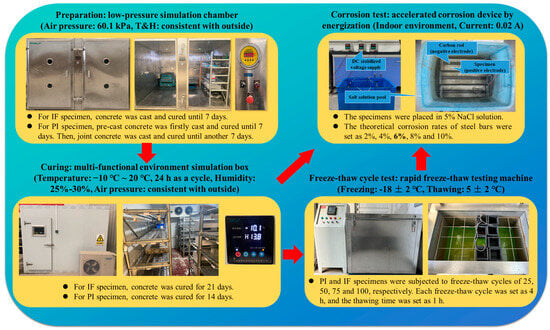 According to the research by Zhang et al. [], the properties of concrete are mainly impacted by low air pressure in the casting and molding stages and the initial stage of curing. Therefore, a low-pressure simulation chamber was designed to simulate the low-pressure condition, where specimens were prepared and initially cured. Further, a multi-functional environment simulation box was designed to simulate the large temperature variation and dry environment, wherein specimens were primarily cured. The plateau environment was simulated using these two devices. In the low-pressure simulation chamber, the concrete mixer, vibration table and air pressure console were included. In the multi-functional environment simulation box, the refrigerating machine, heater, humidifier and temperature and humidity console were contained. According to the environment in the Sichuan–Tibet region in China, the air pressure inside the simulation chamber was set as 60.1 kPa, and the temperature in the simulation box was set as −10~20 °C (±3 °C), which varied between day and night within 1 d. In a cycle, the temperature was maintained at 20 °C for 10 h and −10 °C for 10 h, and there was a heating process (from −10 °C to 20 °C) of 2 h and a cooling process (from 20 °C to −10 °C) of 2 h. The humidity in the simulation box was maintained at 25–30% []. The temperature and humidity in the low-pressure simulation chamber were essentially consistent with those outside, and the air pressure in the multi-functional environment simulation box was normal atmospheric pressure, which was consistent with the condition outside of the box. The IF specimen was cast and cured in the low-pressure simulation chamber for 7 days, and then it was placed in the environment simulation box for 21 days. For the PI specimen, the pre-cast concrete was first cast and cured in the low-pressure simulation chamber for 7 days, and then the joint interfaces were treated by punching and the wet joint was cast and cured in the low-pressure simulation chamber for another 7 days. Finally, the specimen was placed in the environment simulation box for another 14 days. For IF and PI specimens, the entire preparation process lasted for 28 days. After curing, the specimens were taken out for later use. The preparation and test processes and methods of development of the IF and PI specimens are shown in Figure 3.