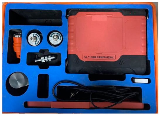 After the corrosion test, the crack width of the specimens was measured using the SK-510 crack detector, the actual average corrosion rate of the steel bar was calculated based on the weight loss of the steel bar, and the diameter of the steel bar after rust removal was obtained using a vernier caliper with an accuracy of 0.01 mm. Here, the mass and diameter of the steel bar after corrosion were measured after the rust on the surface of the steel bar had been cleaned with a rust-remover and anhydrous ethanol, and the steel bar was dried. The crack width of the concrete and the diameter of the steel bar after corrosion were measured at every 20 mm along the longitudinal direction of the specimen. By counting 21 test values, the maximum and average crack widths of specimens were obtained. The diameter of the steel bar was measured twice at positions perpendicular to each other, and the mean of two measurements was adopted as the diameter d of the steel bar for each measuring point. The cross-section loss rate μ (%) of the steel bar was calculated according to Equation (3). Then, the static tensile properties of the corroded steel bar were tested using a universal testing machine according to the Test methods of steel for reinforcement of concrete (GB/T 28900-2022) and the Steel for the reinforcement and prestressing of concrete-Test methods-Part 1: Reinforcing bars, rods and wire, MOD (ISO 15630-1: 2019), and the tensile rate was 10 MPa/s until breaking. Finally, the micro-morphologies of concrete in IF specimens and at the joint interfaces of PI specimens were observed by SEM. The testing instruments, including the dynamic elastic modulus tester and crack detector, are shown in Figure 4 and Figure 5.