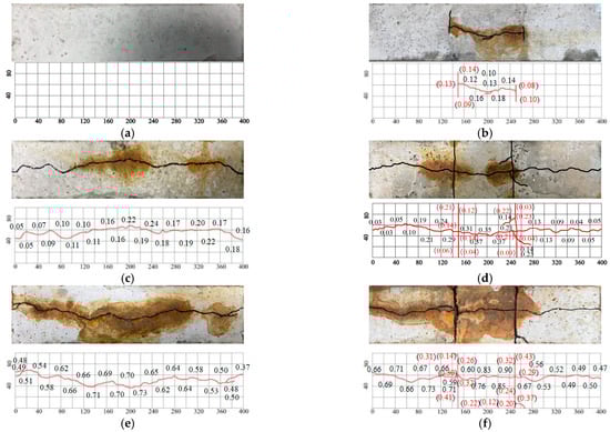 Figure 6 shows the development of cracks of IF and PI specimens when the theoretical corrosion rates of steel bars were 2%, 4% and 10%. Cracks began to appear on the surfaces of the post-cast concrete in the PI specimen when the theoretical corrosion rate reached 2%, which was earlier than that of the IF specimen. There were only longitudinal cracks along steel bars for IF specimens [,], while there were longitudinal cracks along steel bars and transverse cracks along joint interfaces for PI specimens. The transverse crack width was less than that of the longitudinal crack width for the same specimen. Generally, the maximum width cracks were mainly located around the transverse joint interfaces for PI specimens.