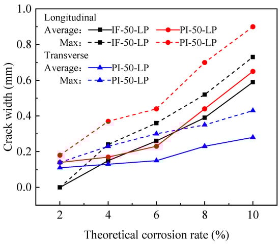 Figure 7 shows the variation curves of maximum and average crack widths with the theoretical corrosion rates for IF and PI specimens. It can be seen that as the theoretical corrosion rates increased from 2% to 6%, the maximum and average crack widths of specimens increase gradually. Subsequently, the increases in maximum and average crack widths became evident. In general, the average longitudinal crack width of the PI specimens was close to that of the IF specimens after the theoretical corrosion rate of 4%. The maximum longitudinal crack widths of PI specimens were always greater than those of IF specimens when the theoretical corrosion rate varied from 2% to 10%. Compared with the longitudinal crack, the transverse crack widths of PI specimens increased slowly, and the maximum and average transverse crack widths were small, resulting from the rust expansion effect of the longitudinal steel bar acting on concrete. Compared with IF-50-LP specimens, the average and maximum longitudinal crack widths of PI-50-LP specimens increased by −11.54~13.33% (average: 6.20%) and 22.22~54.17% (average: 33.57%), respectively.