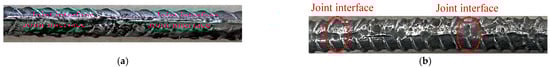 Corrosion morphologies of steel bars in IF specimen and near the joint of PI specimen at a theoretical corrosion rate of 10%: (a) IF-50-LP-10; (b) PI-50-LP-10.