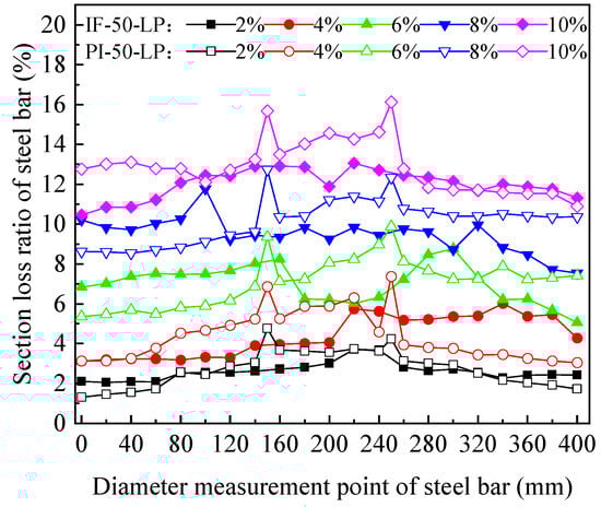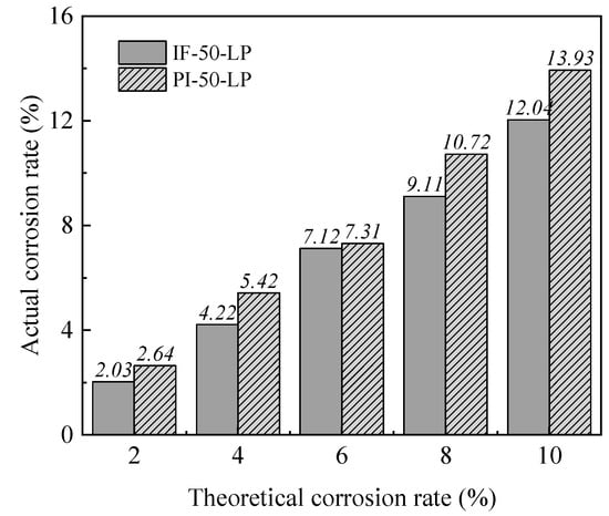 Figure 9 shows the actual corrosion rates of steel bars in IF and PI specimens under different theoretical corrosion rates. The theoretical corrosion rate here can reflect the corrosion time. All the actual corrosion rates of steel bars in the IF and PI specimens exceeded the corresponding theoretical corrosion rates, and the actual corrosion rates of steel bars in PI specimens were always larger than those of IF specimens over the same corrosion time. When the theoretical corrosion rate was 6%, the difference in the actual corrosion rate between IF and PI specimens was at the minimum, which is consistent with the rule presented by the average longitudinal crack width. Compared with IF-50-LP specimens, the actual corrosion rates of steel bars in PI-50-LP specimens increased by 2.67~30.05% (average: 18.90%). This is because the joint interface can provide a path for the penetration of chloride ions.