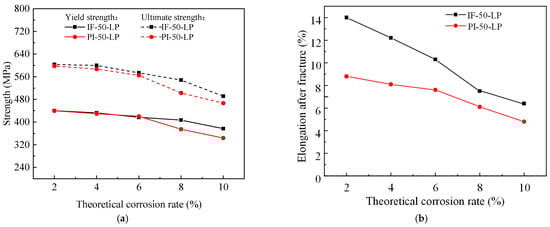 Figure 11 shows the degradation of mechanical properties of steel bars in IF and PI specimens with the corrosion rate. The degradation degrees of the nominal strength (including nominal yield strength and nominal ultimate strength, which are calculated by dividing the yield load and ultimate load of corroded steel bar by its initial cross-sectional area) of steel bars were similar for IF and PI specimens before the theoretical corrosion rate of 6%. When the theoretical corrosion rate exceeded 6%, the degradation rate of the strength of steel bars in PI specimens was greater than that of steel bars in IF specimens, which is mainly due to the more serious section loss of the steel bar at the joint interfaces. In general, the degradation rate of the yield strength of steel bars was similar to that of the corresponding ultimate strength for IF and PI specimens. Compared with the IF-50-LP specimens, the yield and ultimate strengths of steel bars in PI-50-LP specimens decreased by 0.11~8.75% (average: 3.29%) and 0.91~8.30% (average: 3.57%), respectively.