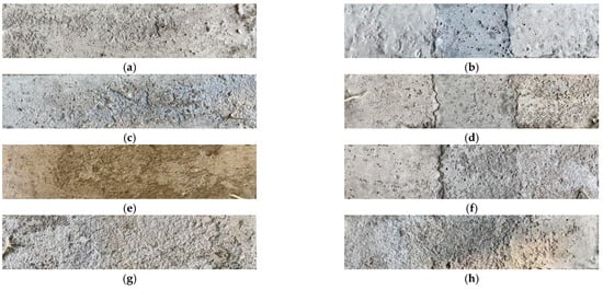 Surface spalling of IF and PI specimens subjected to freeze–thaw cycles; (a) IF-50-LP-25; (b) PI-50-LP-25; (c) IF-50-LP-50; (d) PI-50-LP-50; (e) IF-50-LP-75; (f) PI-50-LP-75; (g) IF-50-LP-100; (h) PI-50-LP-100.