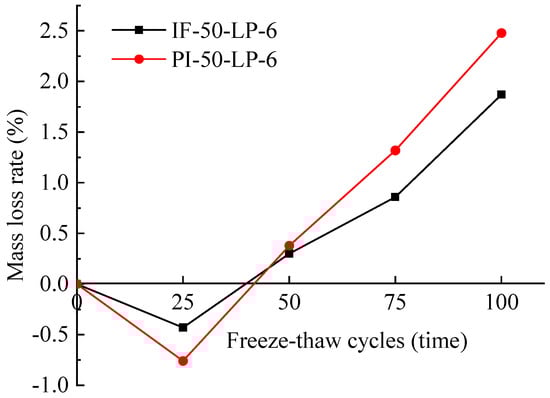 The variation curves of mass loss rate with freeze–thaw cycling for PI and IF specimens are shown in Figure 13. With an increase in the number of freeze–thaw cycles, the surface spalling of specimens became gradually more serious, and the mass loss of specimens increased first and then decreased. The surface spalling of specimens was not obvious after 25 freeze–thaw cycles, but their internal structures were damaged and became more porous due to the freeze–thaw process. Further, microcracks appeared, and the porosity increased inside the concrete. As a result, the water absorption rate of concrete also increased, and the external free water was adsorbed. In addition, because of the influence of the plateau preparation environment, the internal hydration of the specimen was not sufficient. When free water entered the interior of specimens, the hydration reaction continued, thereby increasing the compactness of the concrete. Therefore, when the specimens were subjected to 25 freeze–thaw cycles, their mass increased and the mass loss rates were negative. After 50 freeze–thaw cycles, the mass loss rates of specimens became positive and showed an increasing trend. The mass loss rate of the PI specimen was higher than that of the IF specimen at the same number of freeze–thaw cycles. This is because the joint interfaces, as the weakest area of the specimen, provide a permeable channel for external water. Therefore, the freeze–thaw damage on the PI specimen caused by the frost heaving force became more severe, and its mass loss rate also increased. When the number of freeze–thaw cycles reached 100, the mass loss rate of the PI specimen was 2.48%, which is 32.6% higher than that of the IF specimen. This indicates that the PI specimen underwent a deterioration in its frost resistance due to the existence of joint interfaces.