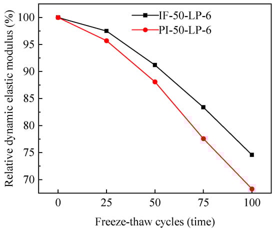 The relative dynamic elastic modulus is an important index used to evaluate the freeze–thaw durability of concrete, and it reflects the internal compactness and damage variation of concrete. The variation curves of the relative dynamic elastic modulus developing with freeze–thaw cycles for PI and IF specimens are shown in Figure 14. The relative dynamic elastic moduli of specimens decreased with the increase in freeze–thaw cycles, and the decrease rate of the relative dynamic elastic modulus also increased with the number of freeze–thaw cycles. This is attributed to the fact that the internal damage of concrete is minor, and its compactness is good, during the initial stages of freeze–thaw cycles, resulting in superior frost resistance. As a result, the relative dynamic elastic modulus decreases at a slower rate. When the number of freeze–thaw cycles exceeded 25, the effect of freeze–thaw damage on concrete gradually became more obvious, the internal structure of concrete became looser, and the compactness decreased significantly []. This in turn increased the water absorption rate, and further aggravated the frost heaving effect. Hence, the decrease in relative dynamic elastic modulus was accelerated under these vicious cycles. Compared to the IF specimens, the relative dynamic elastic modulus of PI specimens decreased rapidly, indicating that the frost resistance of the PI specimen was inferior to that of the IF specimen. When the number of freeze–thaw cycles reached 100, the relative dynamic elastic modulus of the IF specimen became 74.6%. The relative dynamic elastic modulus of the PI specimen was 68.3%, which is 8.45% lower than that of the IF specimen. This can also be attributed to the existence of joint interfaces in the PI specimen, which provided extra penetration paths for external water. The damage to the joint interfaces caused by the freeze–thaw cycles also gradually accumulated.