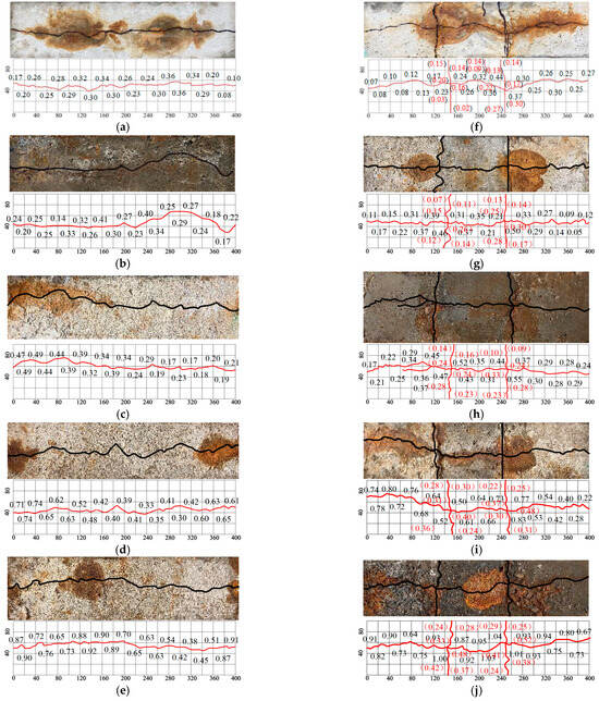 Surface crack development of IF and PI specimens under freeze–thaw–corrosion (Note: For IF specimens, the maximum and average crack widths are indicated in the brackets. For PI specimens, the maximum and average longitudinal crack widths are indicated in the first bracket, and the maximum and average transverse crack widths are indicated in the second bracket.): (a) IF-50-LP-0-6 (0.36, 0.26); (b) IF-50-LP-25-6 (0.41, 0.26); (c) IF-50-LP-50-6 (0.49, 0.31); (d) IF-50-LP-75-6 (0.74, 0.52); (e) IF-50-LP-100-6 (0.92, 0.71); (f) PI-50-LP-0-6 (0.44, 0.23) (0.30, 0.15); (g) PI-50-LP-25-6 (0.50, 0.26) (0.30, 0.18); (h) PI-50-LP-50-6 (0.55, 0.34) (0.33, 0.21); (i) PI-50-LP-75-6 (0.83, 0.61) (0.48, 0.32); (j) PI-50-LP-100-6 (1.04, 0.87) (0.52, 0.35).