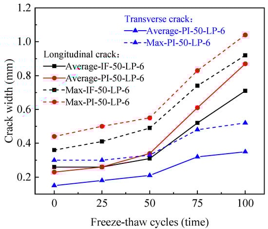 The characteristic values of transverse crack widths of PI specimens increased slowly with the increase in the number of freeze–thaw cycles in the early stage, but the growth of crack widths began to accelerate after 50 freeze–thaw cycles; the development rate of transverse crack widths then decreased after 75 freeze–thaw cycles. This is because the impact of freeze–thaw damage on PI specimens begins to be significant after the number of freeze–thaw cycles reached 50. However, due to the circular distribution of rust expansion force along the length of the steel bars, compared with the development of longitudinal cracks, the growth of transverse crack widths slowed down as they developed, to a certain extent.