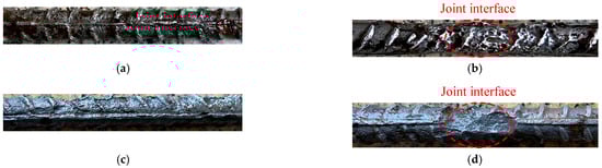 Corrosion morphologies of steel bars in the IF specimens and near the joint of PI specimens after freeze–thaw cycles and corrosion: (a) IF-50-LP-50-6; (b) PI-50-LP-50-6; (c) IF-50-LP-100-6; (d) PI-50-LP-100-6.
