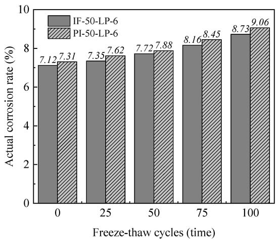 The relationship between the actual corrosion rates of steel bars and the freeze–thaw cycles for IF and PI specimens is shown in Figure 18. It can be seen that the actual corrosion rate of the steel bar increased as the freeze–thaw cycles increased. The actual corrosion rates of IF specimens at 0, 25, 50, 75 and 100 freeze–thaw cycles were 18.67%, 22.50%, 28.67%, 36.00% and 45.50% greater than the theoretical corrosion rate of 6%, respectively. The actual corrosion rates of PI specimens at 0, 25, 50, 75 and 100 freeze–thaw cycles were 21.83%, 27.00%, 31.33%, 40.83%, and 51.00% greater than the theoretical corrosion rate of 6%, respectively. This can be attributed to the fact that the increase in freeze–thaw cycles aggravates the freeze–thaw damage done to the internal structure of the concrete, which makes the intrusion of external ions into concrete easier. Compared with IF specimens, the actual corrosion rates of the steel bars in the PI specimens increase by 2.07–3.78% (average: 3.27%) under freeze–thaw cycling, and the percentage of increase in the actual corrosion rate increased after 50 freeze–thaw cycles. It can be seen that the durability of the PI specimen was affected by the joint interfaces, and this effect became more obvious in the later stages of freeze–thaw cycles.