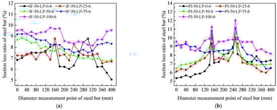 Section loss rates of steel bars in IF and PI specimens after freeze–thaw cycles and corrosion: (a) IF specimens; (b) PI specimens.