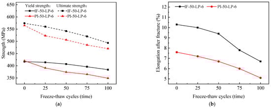 Degradation of mechanical properties of steel bars in IF and PI specimens with freeze–thaw cycles: (a) Nominal yield and ultimate strengths; (b) elongation after fracture.
