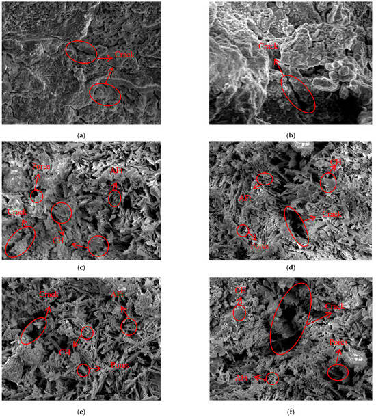 After freeze–thaw cycling and corrosion, in order to further investigate the deterioration mechanism of durability, the PI specimens were sampled at the joint interfaces and the IF specimens were sampled at the middle position in order to carry out the microstructural analysis. The micro-morphologies of the concrete in the IF and PI specimens after freeze–thaw cycles and corrosion are shown in Figure 21. The microstructure of the IF specimen not subjected to freeze–thaw cycling was relatively dense, and its surface was relatively flat [,], while corrosion led to many fine cracks in the interior of the IF specimen. The PI specimen not subjected to freeze–thaw cycles showed a similar microstructure to the IF specimen, but its crack was wider and its microstructure was looser. After 50 freeze–thaw cycles, the IF and PI specimens produced more flaky calcium hydroxide (CH) crystals and needle-like AFt crystals, the concrete microstructure became loose and porous, and the cracks in the concrete increased significantly. Compared with the IF specimens, the PI specimens were subjected to more obvious detrimental effects of the freeze–thaw cycles. This is because the efficiency of external free water moving through the joint interfaces was accelerated by the freeze–thaw cycles, which made the internal structure looser, such that the wet joint could not resist the rust expansion force of the steel bar. Therefore, more cracks and pores appeared inside the concrete near the joint interfaces. With the increase in the number of freeze–thaw cycles, the microstructures of IF and PI specimens were further deteriorated. After 100 freeze–thaw cycles, the calcium hydroxide (CH) crystals in the concrete decreased significantly, and the internal micro-cracks and void obviously increased. With the increase in the number of freeze–thaw cycles, a large number of chloride ions reacted with the hydrated calcium aluminate (CaO.Al2O3.10H2O) at the joint interfaces to form Friedel salt during the process of corrosion. The newly formed Friedel salt further reacted with the hydrated calcium silicate (C-S-H) crystals to produce water-soluble calcium chloride (CaCl2), resulting in a decrease in the compactness of the internal structure of the concrete. It can be inferred that these changes in the micro-morphologies of specimens after freeze–thaw cycling and corrosion are consistent with the law of their macroscopic durability.