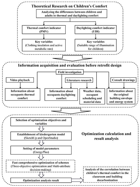 Kindergartens play a crucial role in nurturing the physical, cognitive, and social development of children. Hence, designing kindergarten buildings requires the consideration of the unique requirements and behavior of children. Considering the rapid urbanization of China and its commitment to achieving the 3060 carbon goal, in this study, we examine the retrofitting of kindergarten buildings in China and propose a retrofit optimization method for kindergarten buildings that considers thermal comfort, daylighting, and life-cycle carbon emissions. Through this method, information on the thermal and daylighting comfort of occupants, weather data, occupant scheduling, and envelope and energy system of the kindergarten building to be retrofitted can be obtained through various approaches, such as video playback, field investigation, literature research, and consult drawings. On this basis, optimization variables are selected, and a physical model is established to guide the retrofit process. Afterward, a rapid comprehensive optimization framework based on parallel computing is adopted to obtain the comprehensive optimal design scheme for the building to be retrofitted. The proposed method is applied to a kindergarten building retrofit case in Nanjing, China, and the results show that the optimal comprehensive scheme results in a reduction in carbon emissions of 34,158.3 kg, an increase in the thermal comfort period of 2.7%, and an improvement in daylighting comfort of 79.7% over the benchmark scheme. The significance of this study extends beyond its potential for widespread application in kindergarten building retrofits. It contributes to advancing sustainable building design and environmental stewardship, creating healthier and more comfortable learning environments for children while mitigating the environmental impact of buildings. Moreover, it emphasizes the importance of considering children’s unique needs and behaviors in building design, ultimately leading to better outcomes for their overall development.