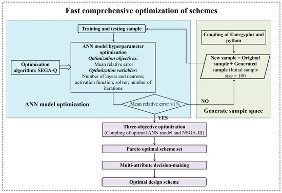 After setting the model parameters, fast comprehensive optimization of the scheme can be conducted. Meta-models represented by artificial neural networks (ANNs) are currently commonly used in design optimization research, and their adoption can effectively increase the efficiency of design optimization by replacing physical models. However, our team has noted in previous studies that generating sample spaces and optimizing ANN models typically require a significant amount of time [10,44]. To address this issue, we propose a scheme for a fast, comprehensive optimization framework based on parallel computing, as shown in Figure 2. The parallel computation process of this framework involves two main components: generating the sample space and optimizing the ANN model. In the calculation process, an initial sample with a size of 100 was generated by coupling EnergyPlus with Python language, and the sample was used for ANN model training and testing (divided into a training set and a test set at a ratio of 4:1). According to our team’s reference [10], the SEGA-Q algorithm was used in this study for ANN model hyperparameter optimization, and the specific process will not be repeated here. When the ANN model is optimized, the sample space generation part is continued. If the mean relative error (MRE) of the optimized ANN model meets the requirement (MRE ≤ 1%), the model is adopted in the subsequent analysis. If not, the generated samples are added to the initial sample set to form a new sample, which is then used to optimize the ANN model. After obtaining the optimal ANN model, it can be combined with optimization algorithms for multi-objective optimization calculations to generate a Pareto solution set. Our team has compared the performance of the above three algorithms in building design optimization in previous studies [9,10], and the results show that the NSGA-II provides significant advantages. However, in reference [45], the performance of the NSGA-II and NSGA-III models was further compared in building design optimization, and the results showed that the NSGA-III model is more suitable for solving multi-objective optimization problems with more than two objectives. Therefore, the NSGA-III model was used as a multi-objective optimization algorithm in this study. On this basis, this study uses the entropy weight method to screen the Pareto set, in order to select a comprehensive optimization scheme that takes into account thermal comfort, daylighting, and life-cycle decarbonization [46].