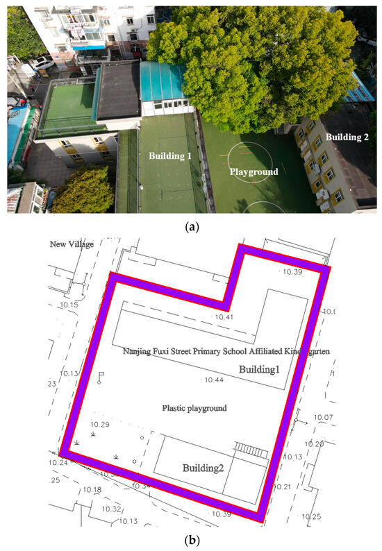 Appearance (before retrofit) and overall layout of the kindergarten: (a) appearance of the kindergarten area (obtained by an unmanned aerial vehicle); (b) overall layout of the kindergarten (derived from original drawings).