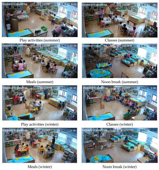 Based on the content in Section 2, the first step involves conducting a survey to evaluate the thermal comfort of children in the kindergarten. To this end, we employed field investigation and video playback techniques (as illustrated in Figure 5) to gather information on the annual clothing conditions of children across three grades in the kindergarten. Subsequently, we calculated the clothing insulation for each period using Equation (2), and the results are listed in Table 2. Additionally, we collected information on the height and weight of the children in these three grades. With the use of these data and Equations (3)–(6), we calculated the metabolic rate of the children under various activities, as presented in Table 3. Notably, there is no essential difference in the activity metabolic rate among the students of different grades, and there is no need to treat this factor differently during optimization.