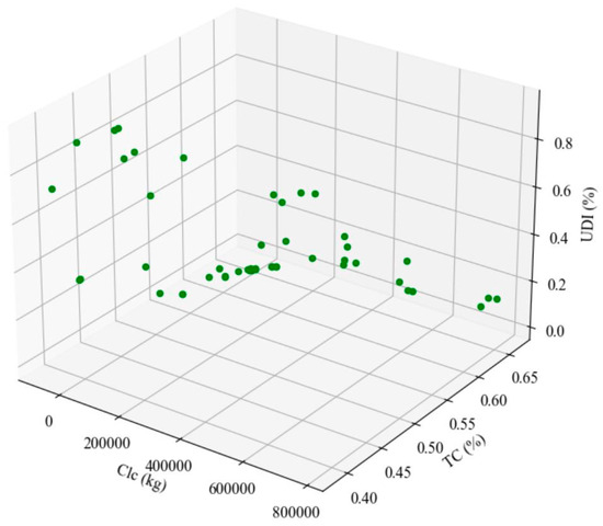 On this basis, the optimal ANN model is combined with the NSGA-III to perform a three-objective optimization calculation (with a population of 50), and the outcomes are demonstrated in Figure 7. It can be seen that there are a total of 50 Pareto solutions in the Pareto solution set, among which the range of is −77,336.1–785,327.2 kg; the range of is 38.5–66.4%; and the range of is 1.2–93.3%. As all the aforementioned solutions are nondominated, a multi-attribute decision-making method is necessary to further select the optimal design scheme. Based on the relevant content in Section 2.2.3, the comprehensive optimal scheme attained in this research is presented in Table 9 and Figure 8. Additionally, considering that most of the retrofit schemes for buildings in actual engineering are designed according to codes, this study also generated the benchmark scheme based on the code [48] (as shown in Table 9) and compared it with the comprehensive optimal scheme.