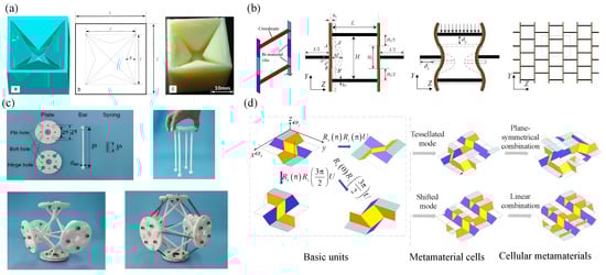 Li et al. [] introduced an innovative unit-cell design founded on the re-entrant framework capable of attaining a Poisson’s ratio ranging from −1 to −0.5, as illustrated in Figure 1a. They proposed a bi-material structure featuring a two-dimensional quadrilateral structure that can transition between concave and convex states through temperature modulation [], facilitating the manipulation of positive and negative Poisson’s ratios shown in Figure 1b. Yin et al. [] developed a mechanically tunable metamaterial based on a regular octahedron tensile structure in Figure 1c and constructed a theoretical model to forecast its mechanical characteristics.
