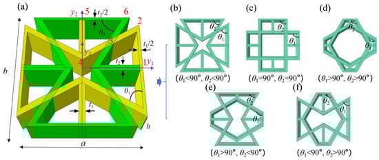The unit cell of the OHH consists of horizontally and vertically arranged honeycombs in an orthogonal configuration. Its geometric features include length a, width b, height h, wall angles and , as well as wall thicknesses and . In conventional honeycombs, wall angle serves as a crucial geometric parameter. A wall angle below renders the re-entrant honeycomb, often displaying auxetic characteristics. As a result, present honeycombs are categorized into four classifications: negative Poisson’s ratio OHH (OHH-NPR, Figure 2b), zero Poisson’s ratio OHH (OHH-ZPR, Figure 2c), positive Poisson’s ratio OHH (OHH-PPR, Figure 2d), and semi-OHH (Figure 2e,f).