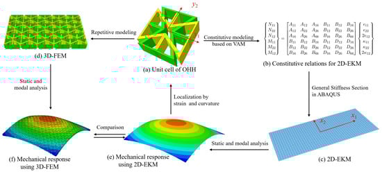 Equivalent modeling of OHH panels, the global analysis (a) of the three-dimensional FE model (3D-FEM) (b) involves constitutive modeling at the unit-cell level (c) and global analysis (d) using the two-dimensional equivalent Kirchhoff–Love model (2D-EKM) (e) with constitutive relations of A, B, and D submatrix (f). The mechanical response of 2D-EKM (d) can be sent back into the unit cell (c) for local field recovery.