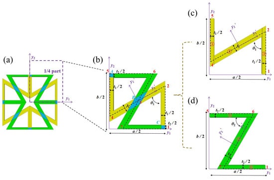 Partition diagram for the strain energy of the OHH unit cell: (a) Unit-cell of OHH, (b) 1/4 part pf unit cell, (c) Quarter unit cell in the direction, and (d) Quarter unit cell in the direction.