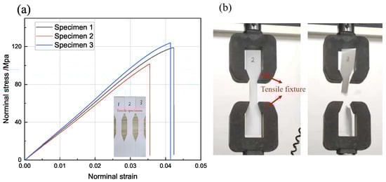 (a) Stress–strain curve of PLA material and (b) setup for standard tensile test.