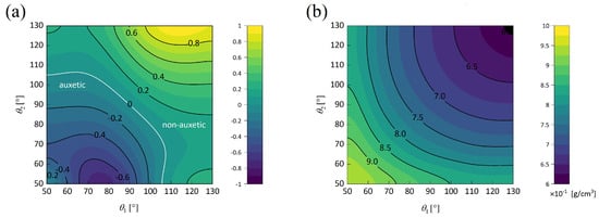Evaluation of (a) equivalent Poisson’s ratio and (b) equivalent density of the OHH as a function of the wall angles and .