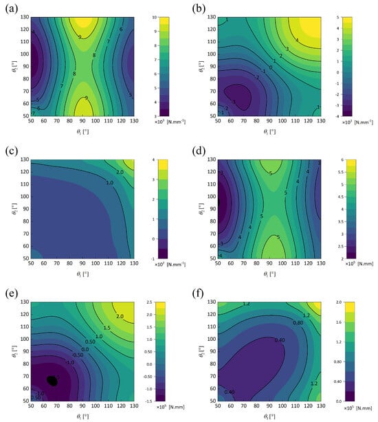 Figure 7 illustrates the contour plots of equivalent stiffness obtained by the present model. Figure 7a,d demonstrate that the equivalent stiffness along the principal axis direction, denoted as and , reaches its peak when angles and approach 90 degrees. Deviation from these angles results in a gradual decrease in the equivalent stiffness along the principal axis. This phenomenon is attributed to the presence of inclined walls at non-90-degree angles. Under the application of identical external forces, an angular deviation exists between the wall and the force direction, leading to the decomposition of the force into components along and perpendicular to the wall axis. Only the axial component influences tensile stiffness, consequently diminishing the equivalent stiffness along the principal axis. As angles and increase, the Poisson effect induces a transition of and from negative to positive values, as illustrated in Figure 7b,e, prompting a redistribution of mass towards the unit cell’s periphery. This redistribution enhances the resistance of OHH to shear and torsion with increasing angles of and , consequently elevating the values of and , as illustrated in Figure 7c,f.