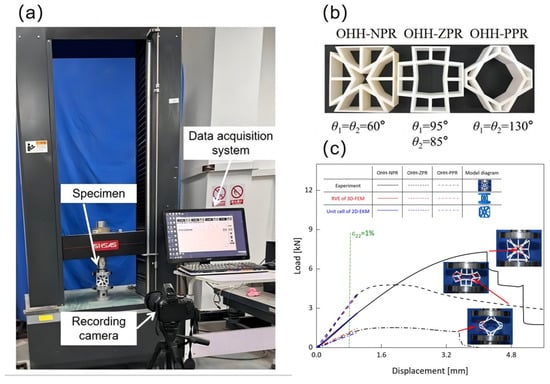 To validate the accuracy of the equivalent properties and assess the compressive behaviors of the OHH with varying Poisson’s ratios, OHH-NPR, OHH-ZPR, and OHH-PPR cells in Figure 8b were fabricated via 3D printing for uniaxial compression tests at the unit-cell level, as illustrated in Figure 8a. A rigid steelhead was placed on top to compress the specimen into a quasi-static compression state. The compression speed of the testing apparatus was maintained at 0.5 mm/min along the 2-direction, with a maximum displacement of 5.6 mm (−0.07).