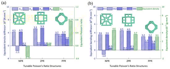 In aerospace, precision instruments, and civil engineering, accurate control of structural deformations is frequently essential. Traditional structures with a fixed positive or negative Poisson’s ratio face challenges in meeting the intricate requirements of engineering [,]. Thus, the exploration of structures with tunable positive/zero/negative Poisson’s ratios holds heightened practical importance []. Extensive research endeavors have resulted in a series of groundbreaking advancements in the investigation of tunable Poisson’s ratio structures, as showcased in Figure 1.